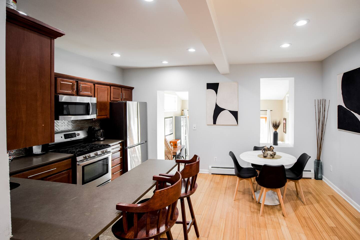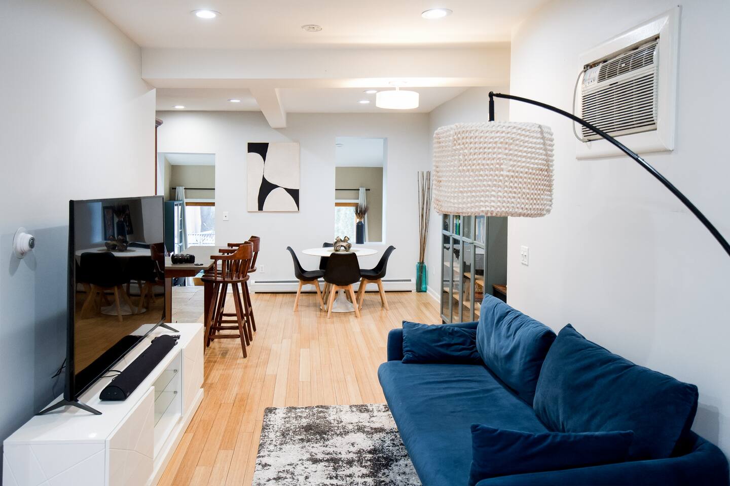 Enjoy a mid-century modern/boho home just 20-25 mins from NYC! This stylish retreat features themed bedrooms, a cozy reading nook, and a backyard with a fire pit. Walk to top-rated restaurants, cafes, and shops. Easy access to buses and ferries makes exploring NYC a breeze. Stroll Boulevard East for breathtaking skyline views. Fast Wi-Fi, a full kitchen, and smart TVs provide comfort. Ideal for families, couples, and business travelers. Book now for the best of NJ & NYC!